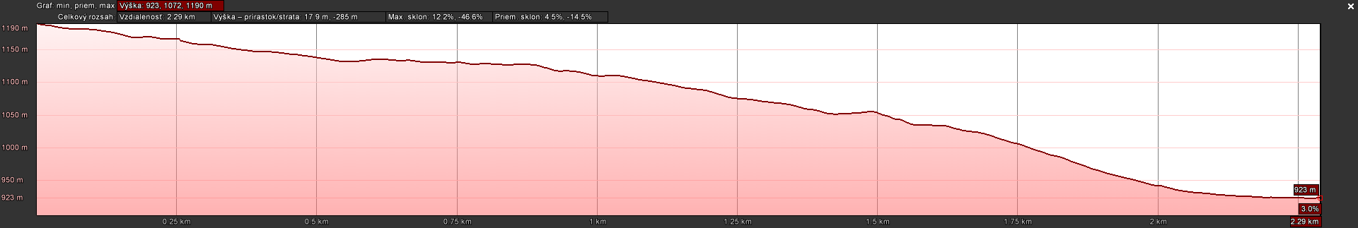 The track begins at the top of Malinô Brdo near the top station of the chair lift, but it immediately enters the woods along a steeper slope and connects to a gravel road combined with a broken asphalt road. It exits to Vlkolínec meadows near the Mini Zoo, at the foot of Sidorovo Peak.