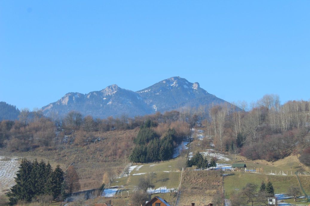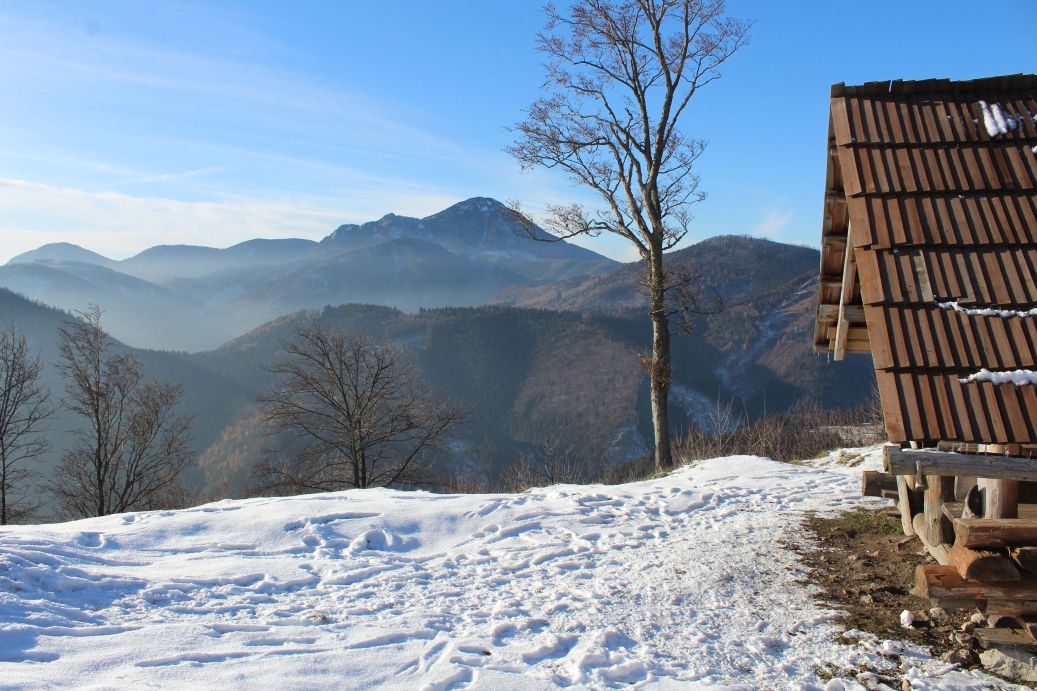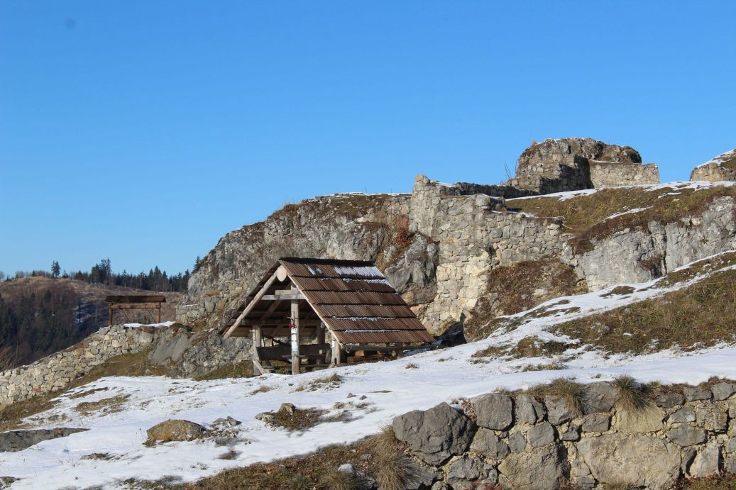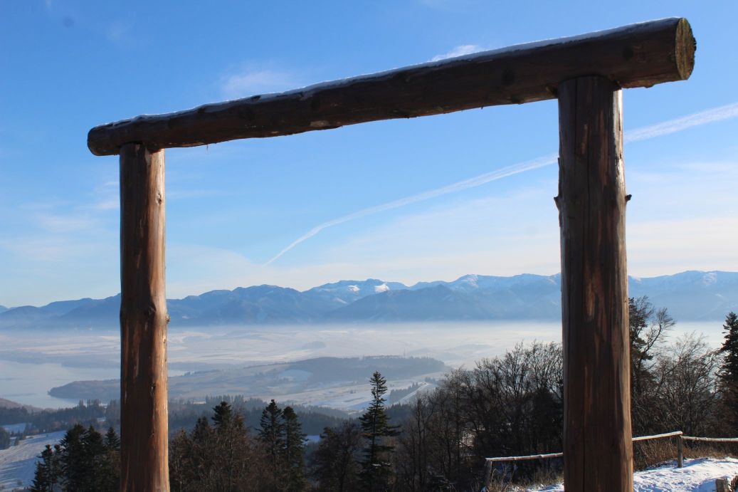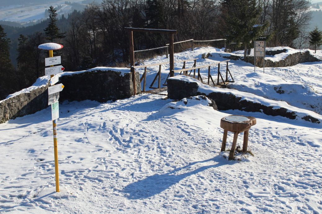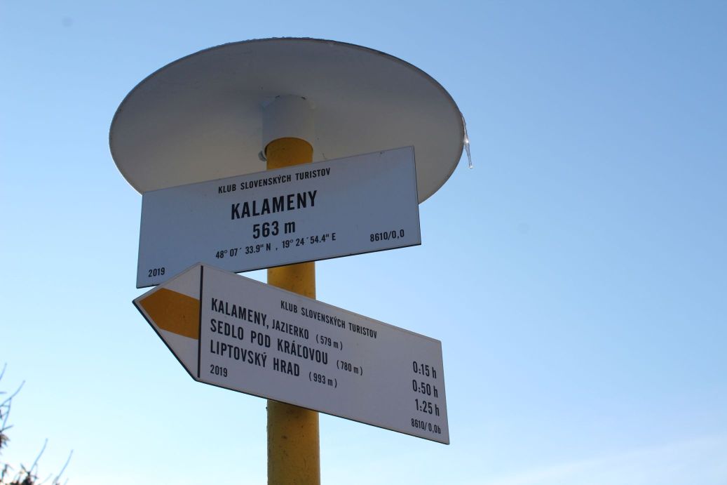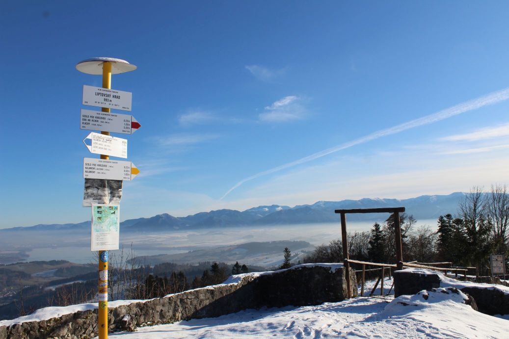 The route begins by the hiking signpost in the centre of Kalameny, by the Church of St. Peter and Paul, and continues mildly uphill, past the stone cellars built into the slope by the road. It passes by the cemetery, above the soccer field, and continues towards the valley. On the left side, on the hill above the houses, you might notice an animal pen with roe deer. At the mouth of the valley, the route passes by a ski tow, behind which you will find a pond with hot mineral water. Visitors use it for bathing all year round. Right behind the pond, there is a mineral spring and a spring, both are unaltered and not in use. At this place, a blue-marked hiking trail is crossing the route. The route continues to the right (not to the valley) on a path running through trees and bushes. It arrives at a meadow, where the marking of the route starts to disappear. However, you simply need to stay at the periphery of the woods and continue uphill to the top of the meadow, to notch Sedlo pod Kráľovou. The section leading to the notch reveals views, at first of the village of Kalameny and later of the ridge of the Low Tatras and a part of the Great Fatra. In the notch, a red-marked hiking trail joins our route and we get a new view, of the West Tatras, through the trees. The wood path continues a bit more steeply uphill into the woods, all the way to the place where the uphill section ends. At this place, you need to exit the wood path and continue on a less distinct path in the direction to the right. The path passes by a collapsed cabin (Chata Kata) and continues to a sharp left-hand curve, which reveals more views. The ascent becomes less steep, and through an S-curve, the path by-passes the summits of Sestrč hill. The path arrives at the castle cliff and ends here. The route continues further to the castle cliff and to the Liptov Castle situated on the cliff. In order to climb to the castle cliff, you need to use a metal ladder with length of approximately five metres. The ladder is slippery and movement on it is dangerous, therefore all children under the age of 15 should only use it under the supervision of their parents. The route ends at the site of the castle, by the hiking signpost. Situated at the castle is a shelter with a wood carving of the castle, a hikers’ book and a game of “Ludo”. There is a stainless-steel viewpoint compass rose you can use for better orientation. A more attentive visitor may also notice a small commemorative plaque dedicated to PhDr. Václav Hanuliak, the leader of the archaeological research of the Liptov Castle in years 1976 to 1983. The views from the castle itself include the West Tatras, the Liptov Basin, the ridge of the Low Tatras, a part of the Great Fatra and the dominant peak of Great Choč.