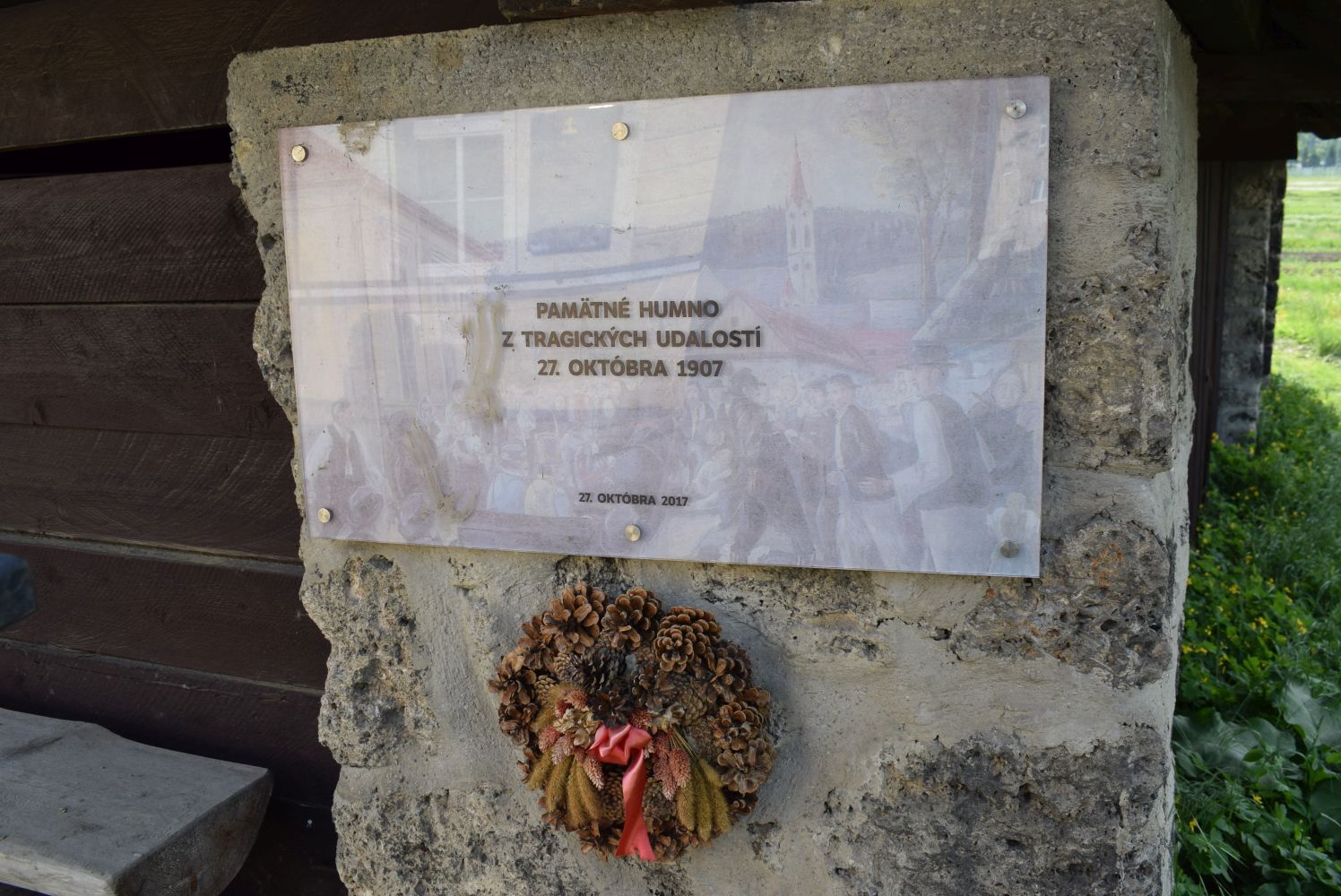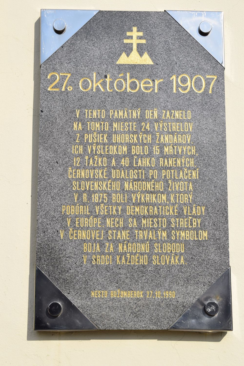 The sad events are commemorated by the memorial plaque on the Community Centre building in Černová. The plaque reads the following: ”October 27, 1907. On this memorial day, 24 shot were fired at this place from rifles of Austro-Hungarian policemen. In consequence, 15 people ended up dead, 12 with severe injuries and 40 with light injuries. After suppression of Slovak national life in 1875, the events in Černová were a scream which outraged all democratic governments in Europe. Let the place of shooting in Černová become a permanent symbol of fight for national freedom in the heart of all Slovak people.”