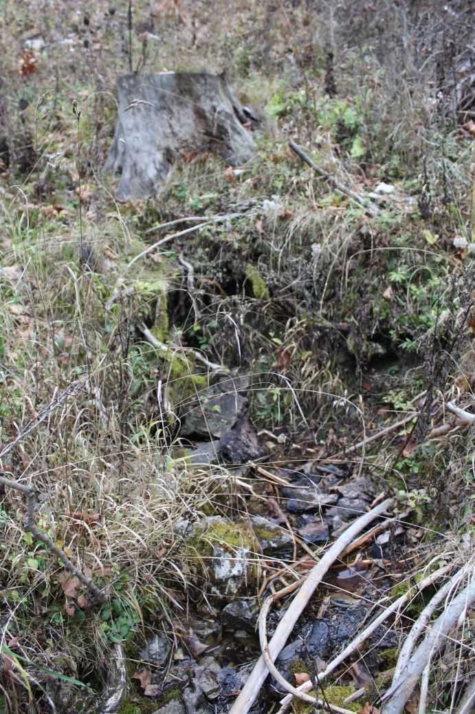 – The water from the spring flows underneath thrown branches from logging, into the woods, where it is more visible. However, we recommend collecting the water up at the spring.