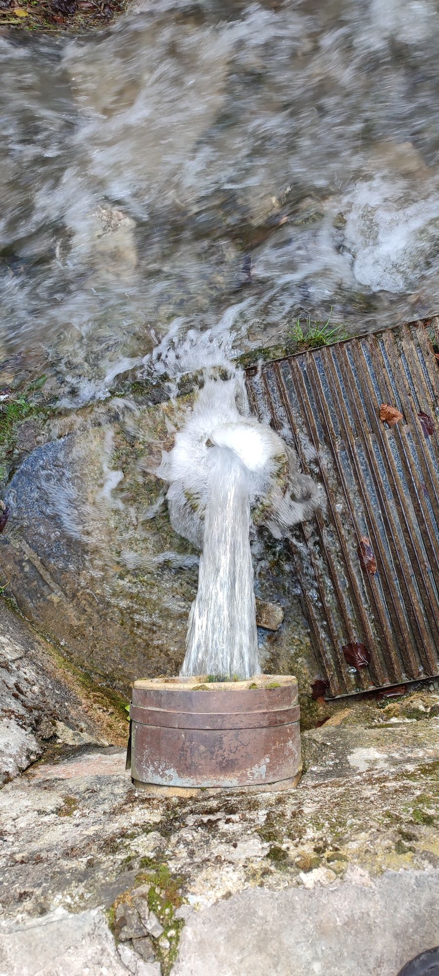 – The water surfaces from an earthenware pipe located in a concrete wall at the bank of the creek.