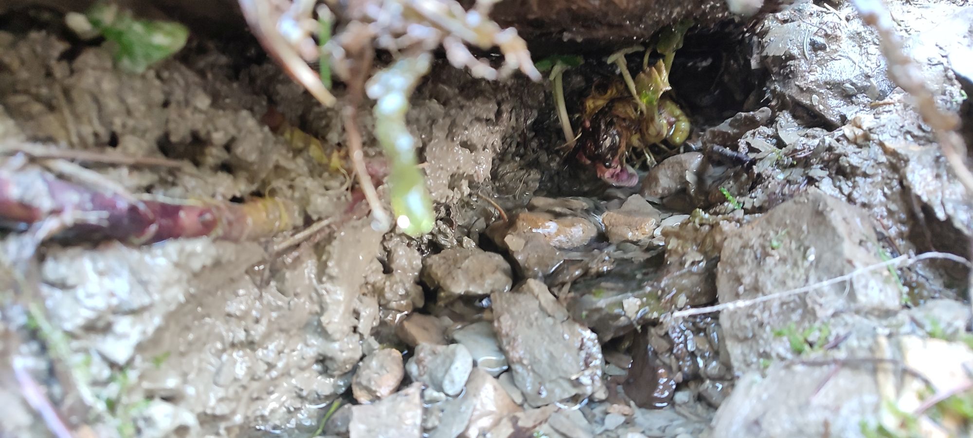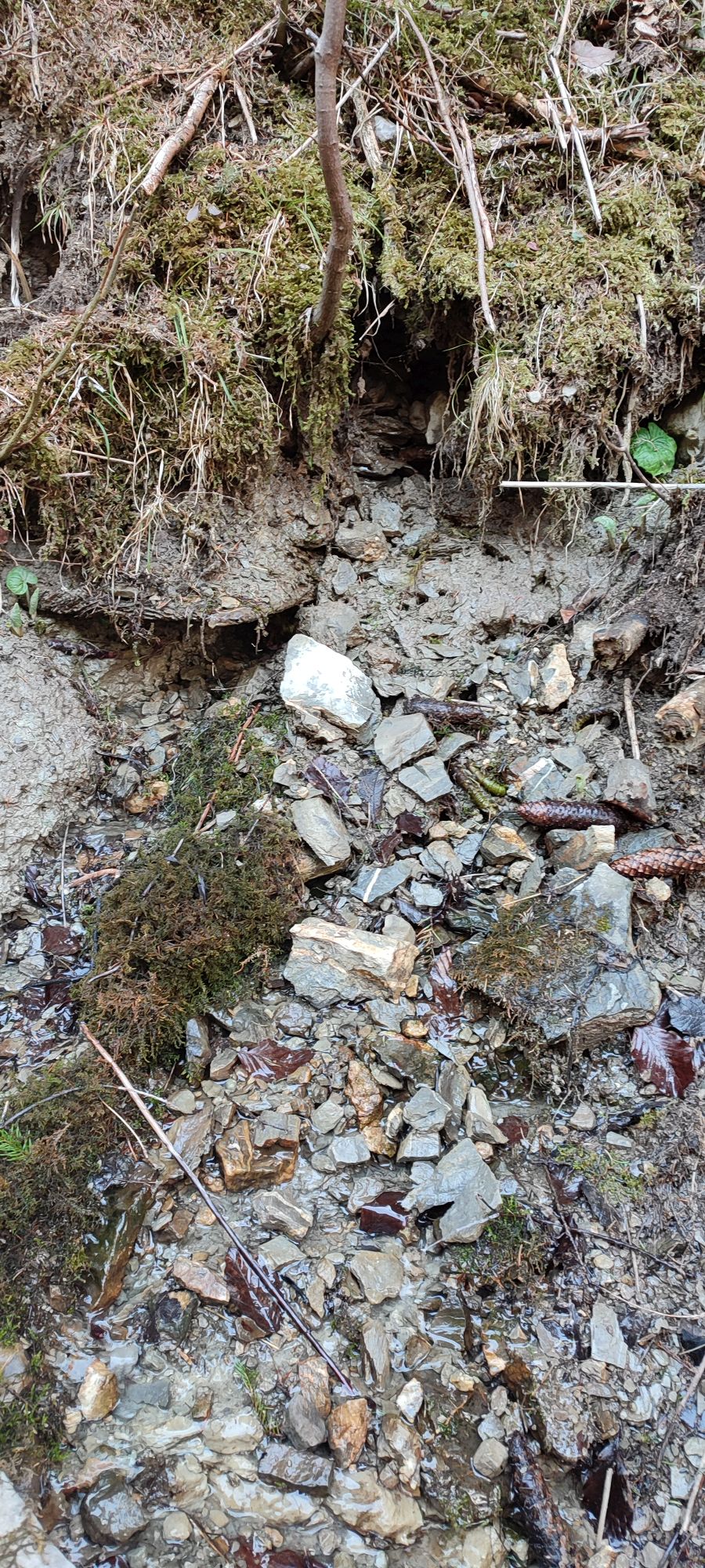 – The water surfaces from a rocky bed in a steep slope, approximately 5 metres above the road.