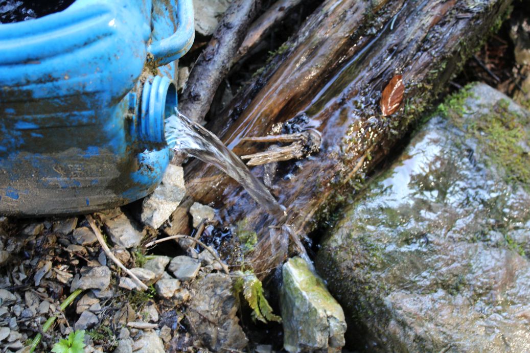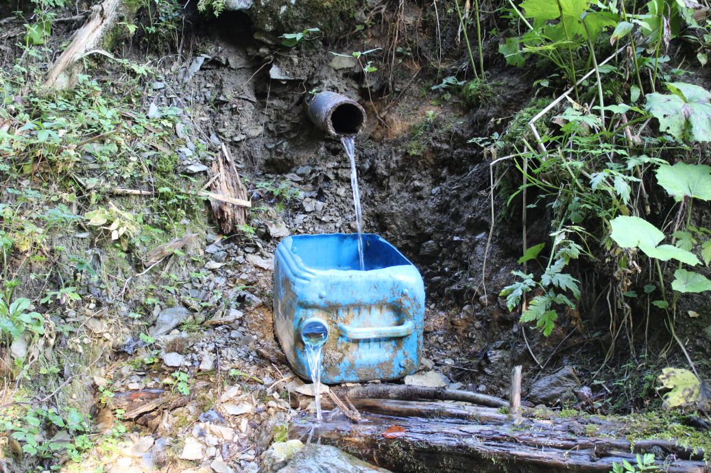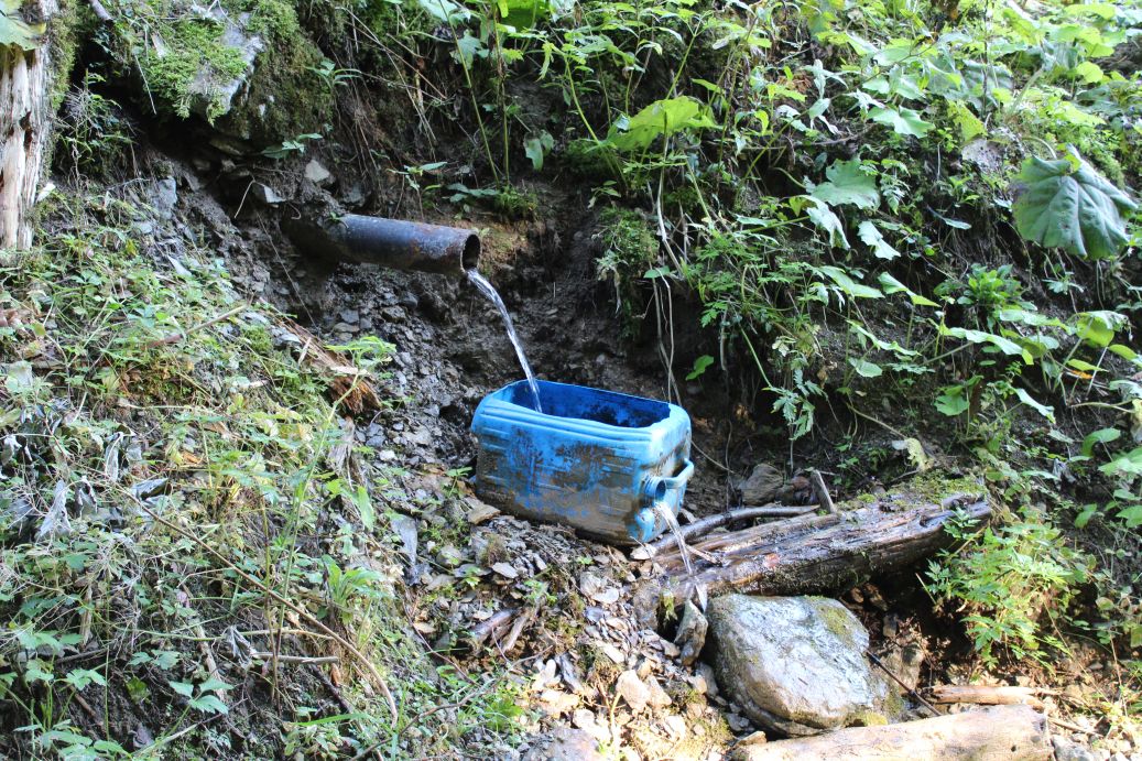 – The water flows into a plastic tank, which serves as a water source for animals.