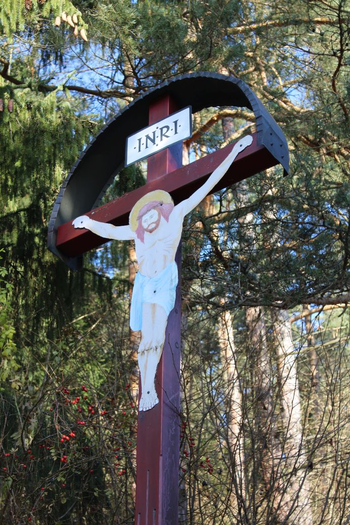 – The cross is made of wood, with a sheet metal depiction of Christ.