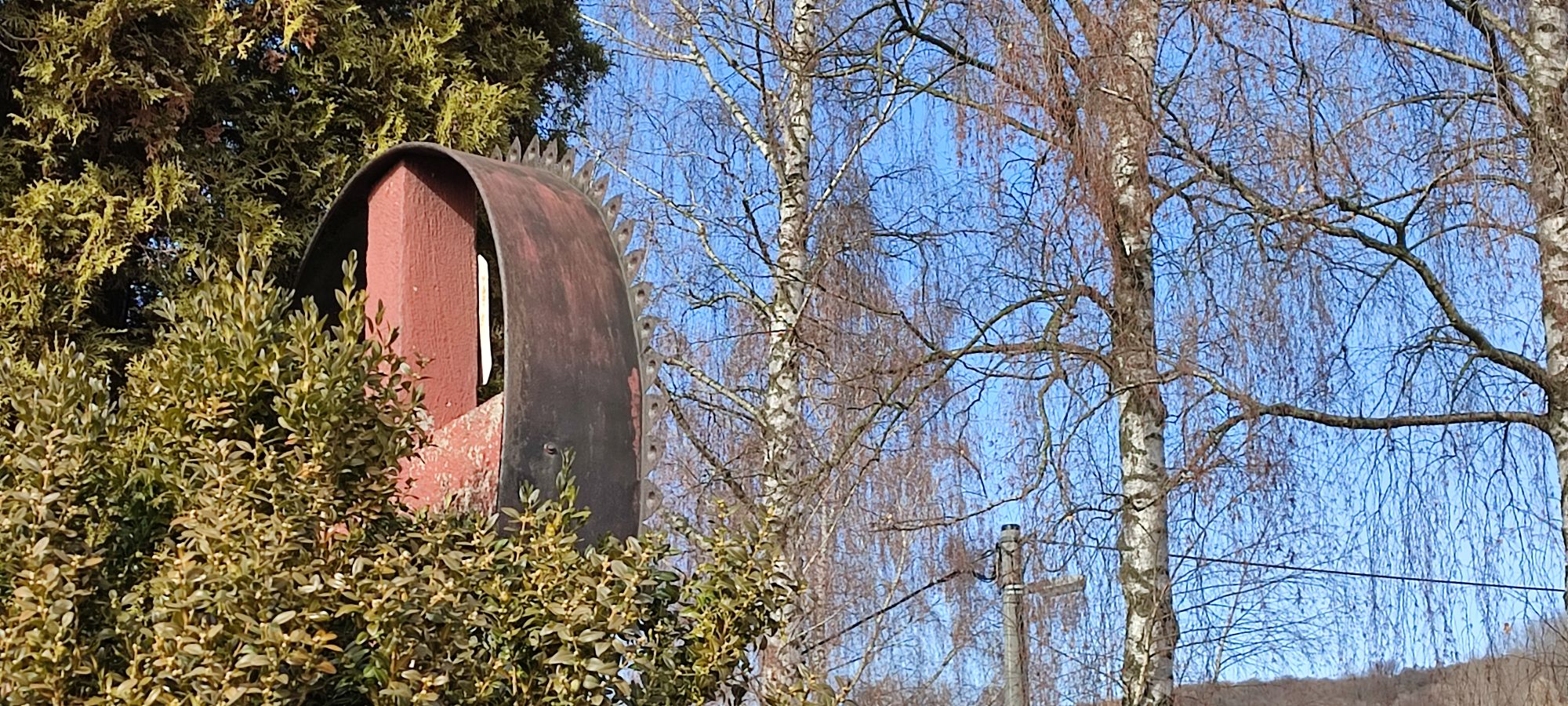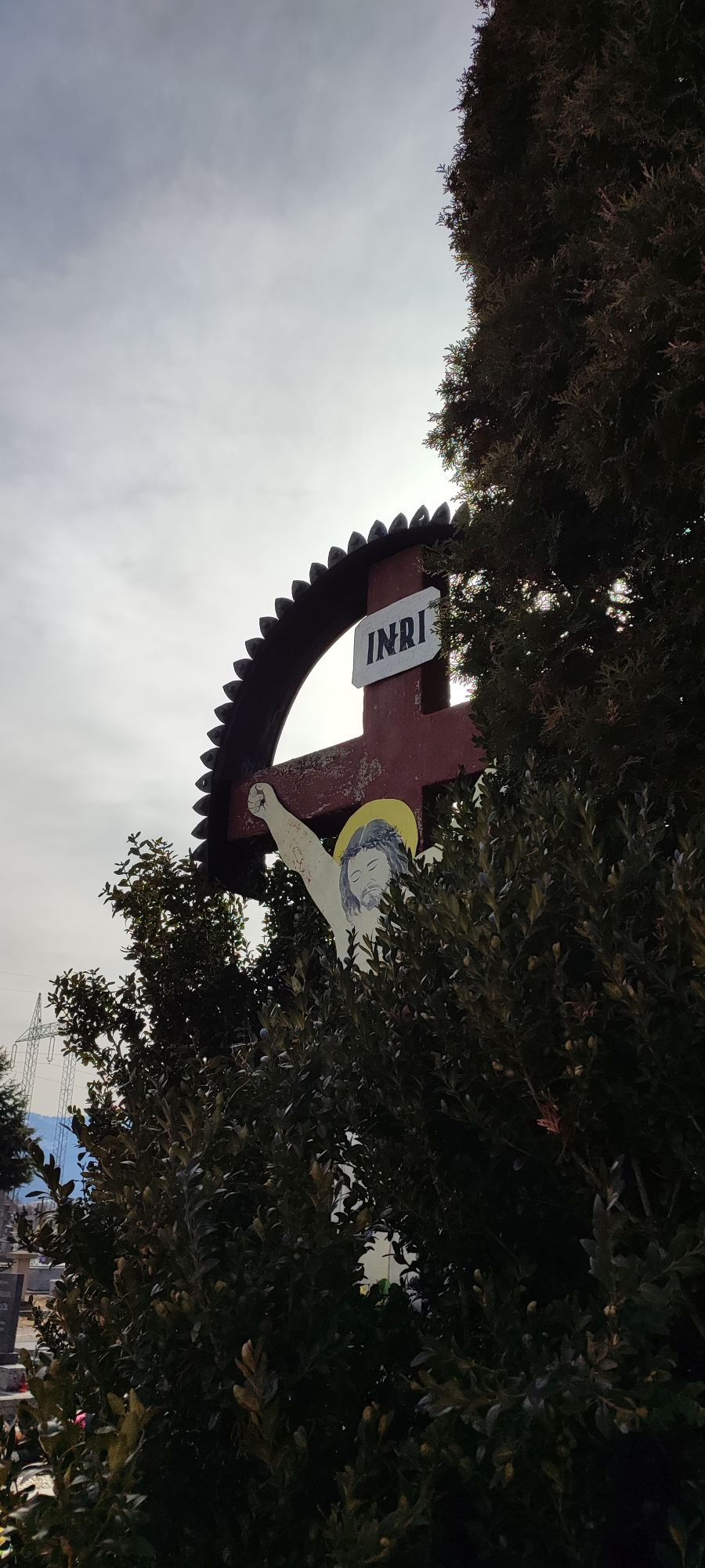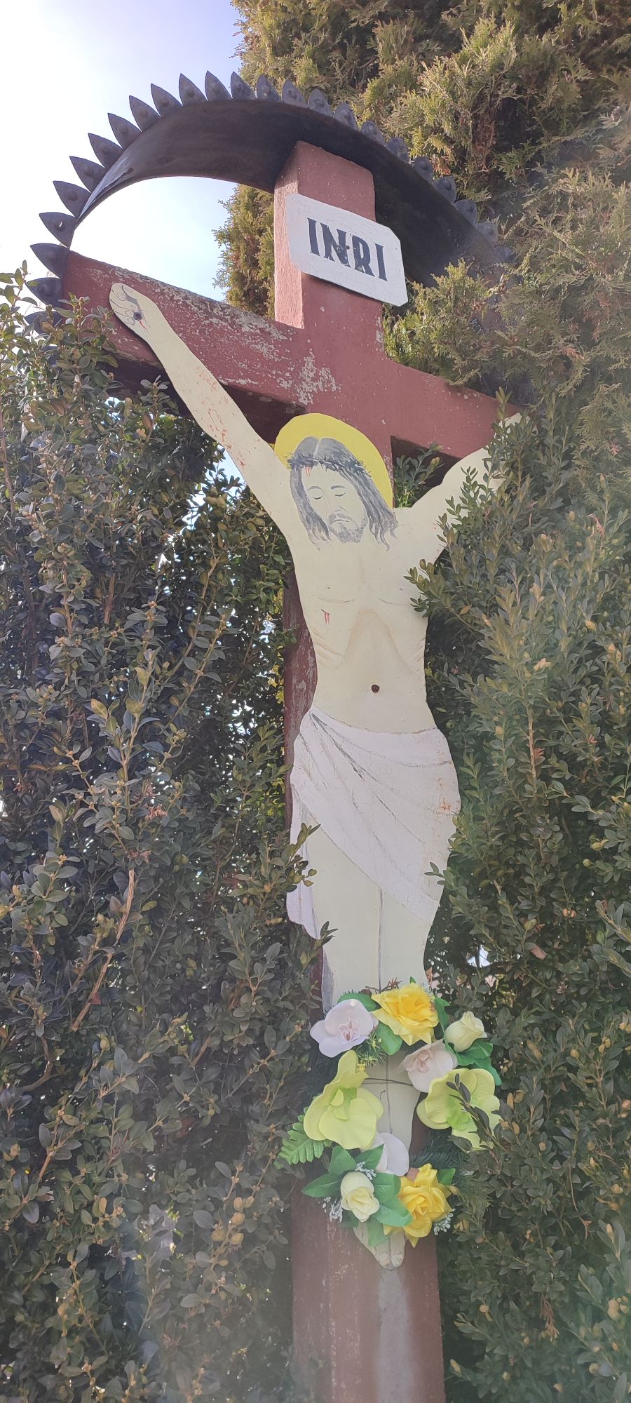 – The cross is made of concrete, with a sheet metal depiction of Christ.