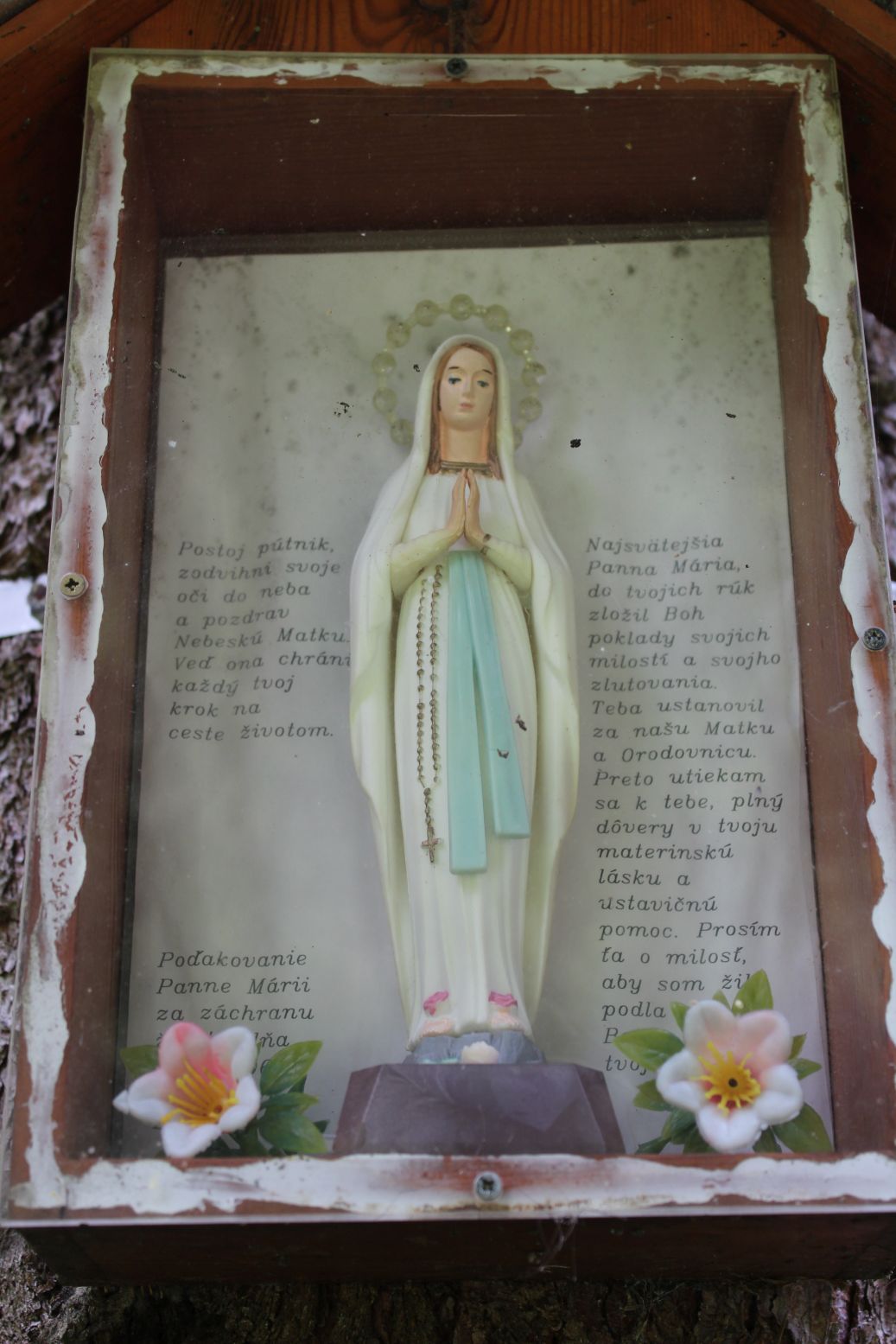 – Placed inside the frame is a statue of a saint and text of a prayer.