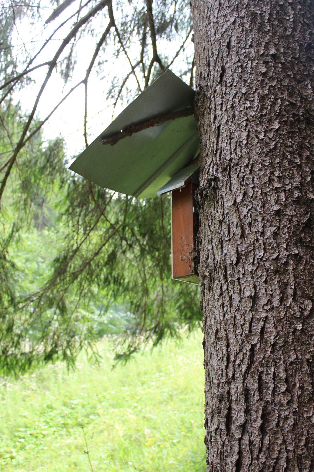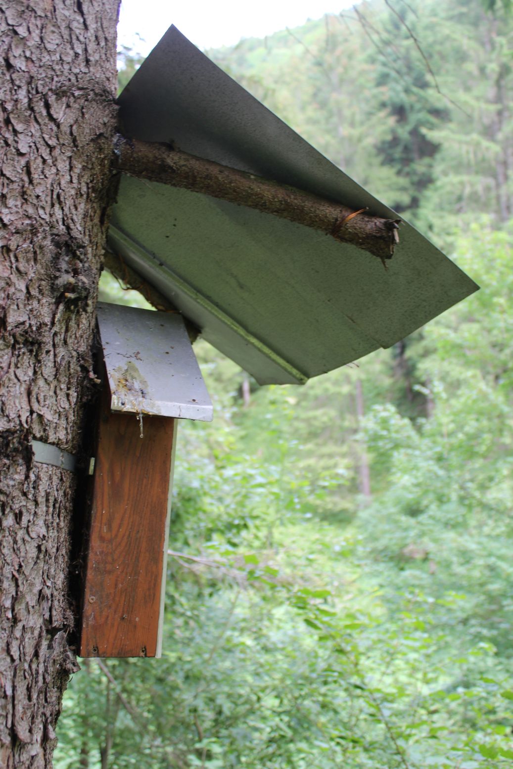 – There is a small cross carved in the shield below the sheet-metal roof.