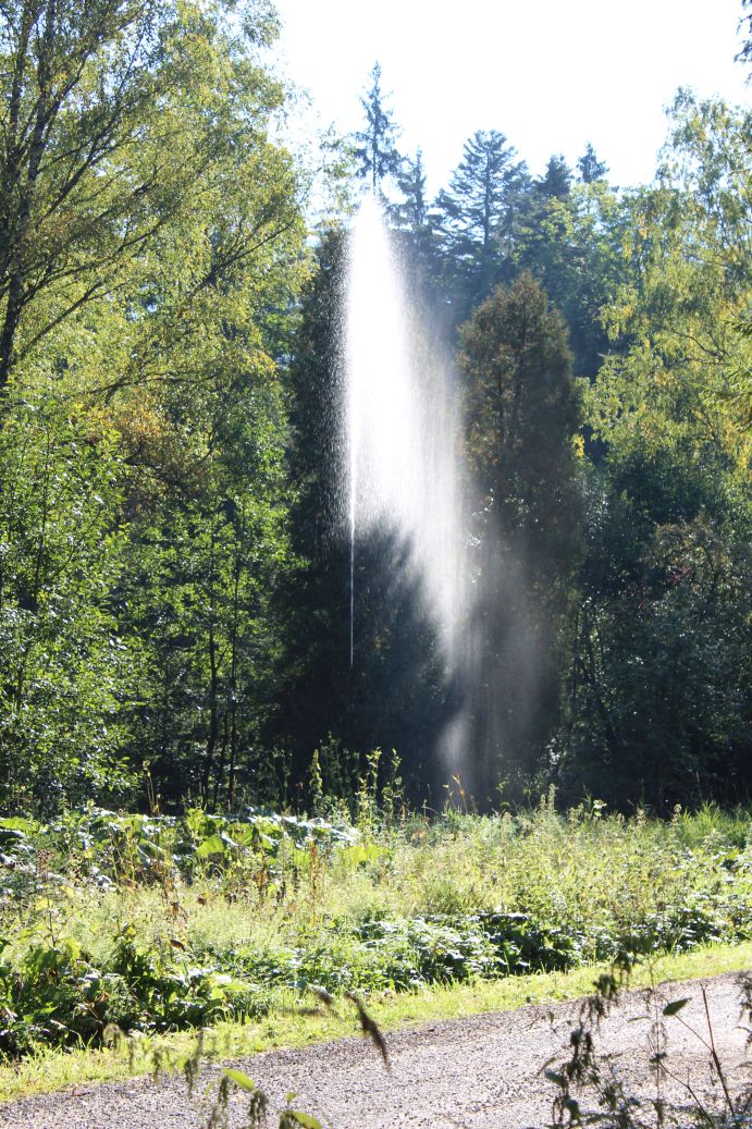 – Voda strieka z kovovej rúrky a rozprašuje sa nad kameňmi vyloženým jazierkom.