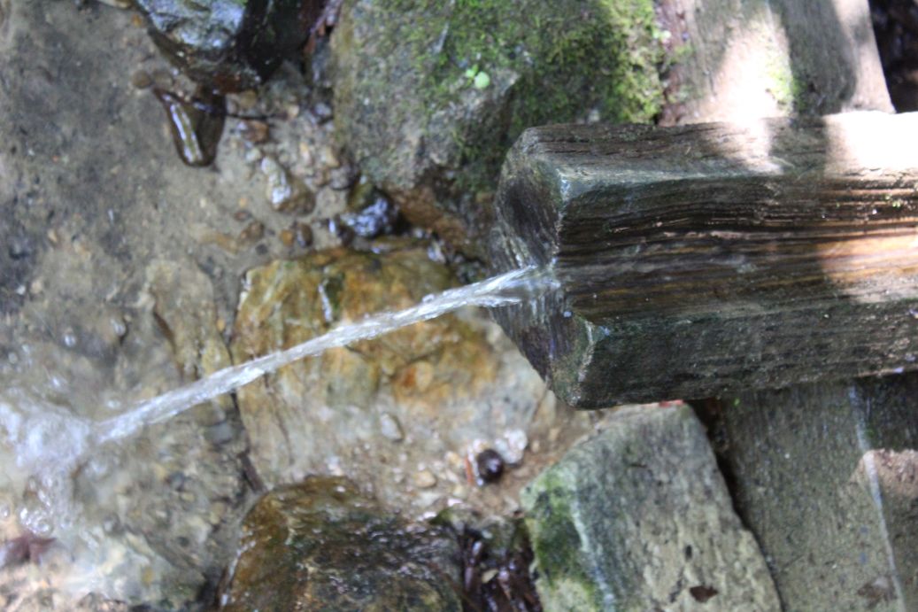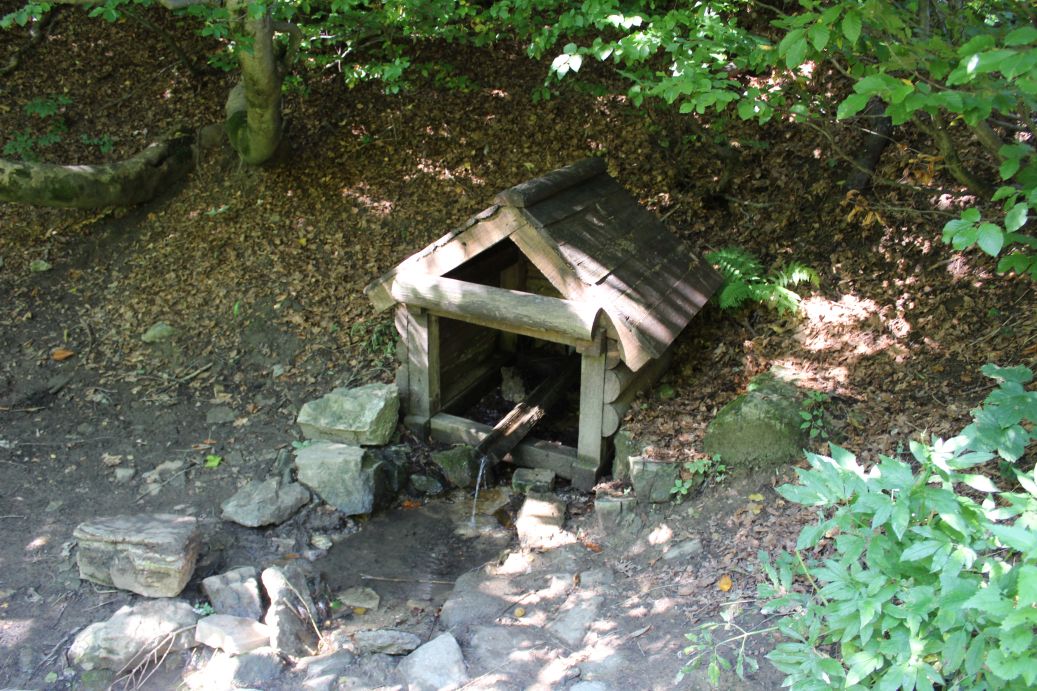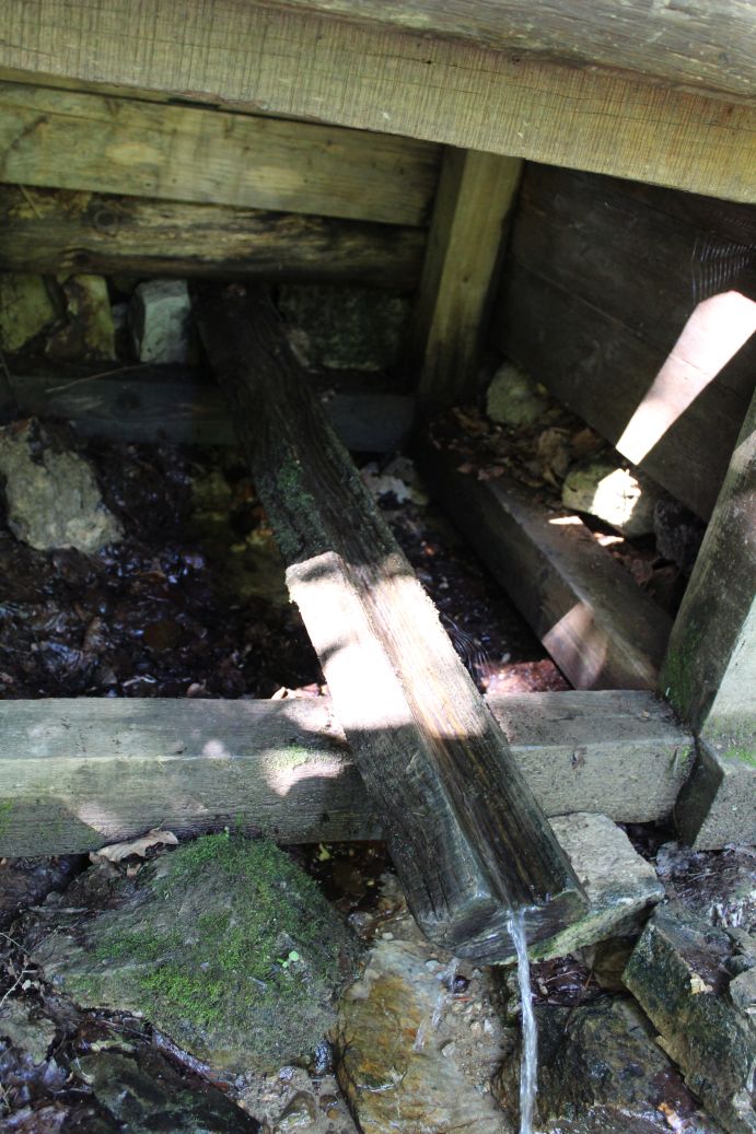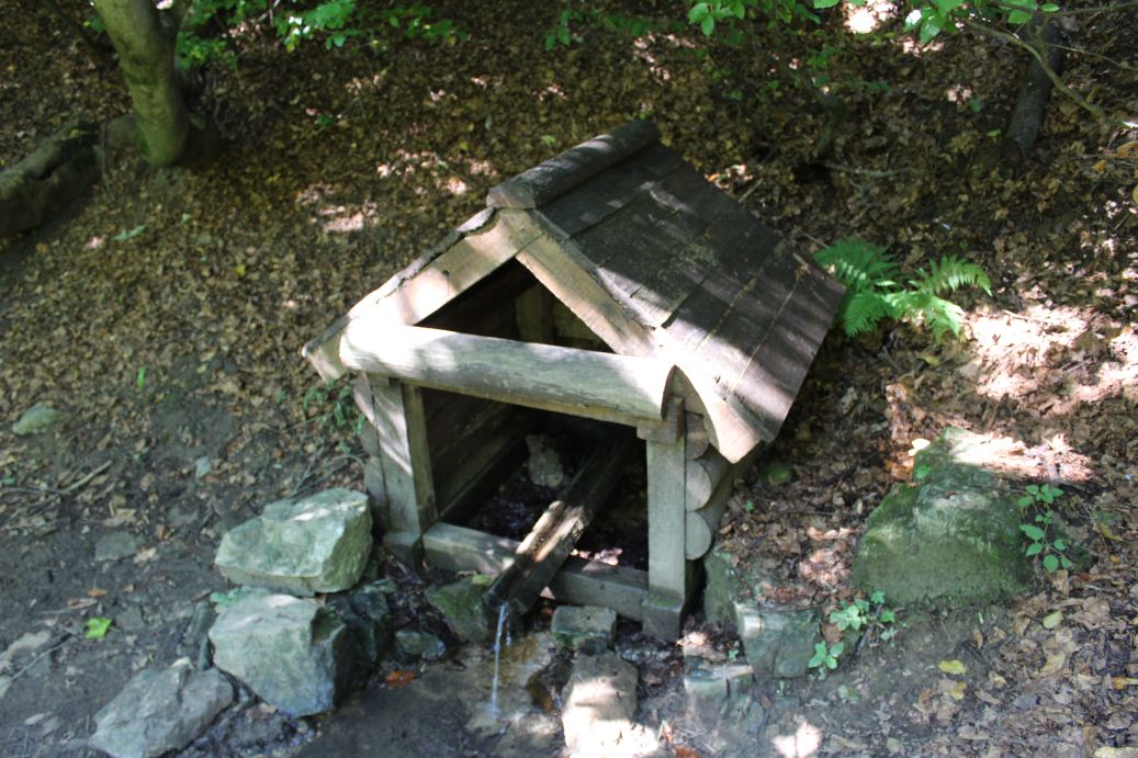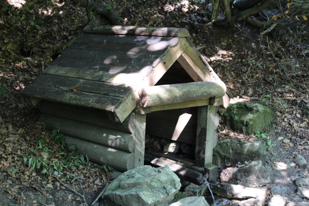 – Voda vyviera zo svahu pod stromami do dreveného žliabku, nad ktorým je postavená drevená konštrukcia studničky.