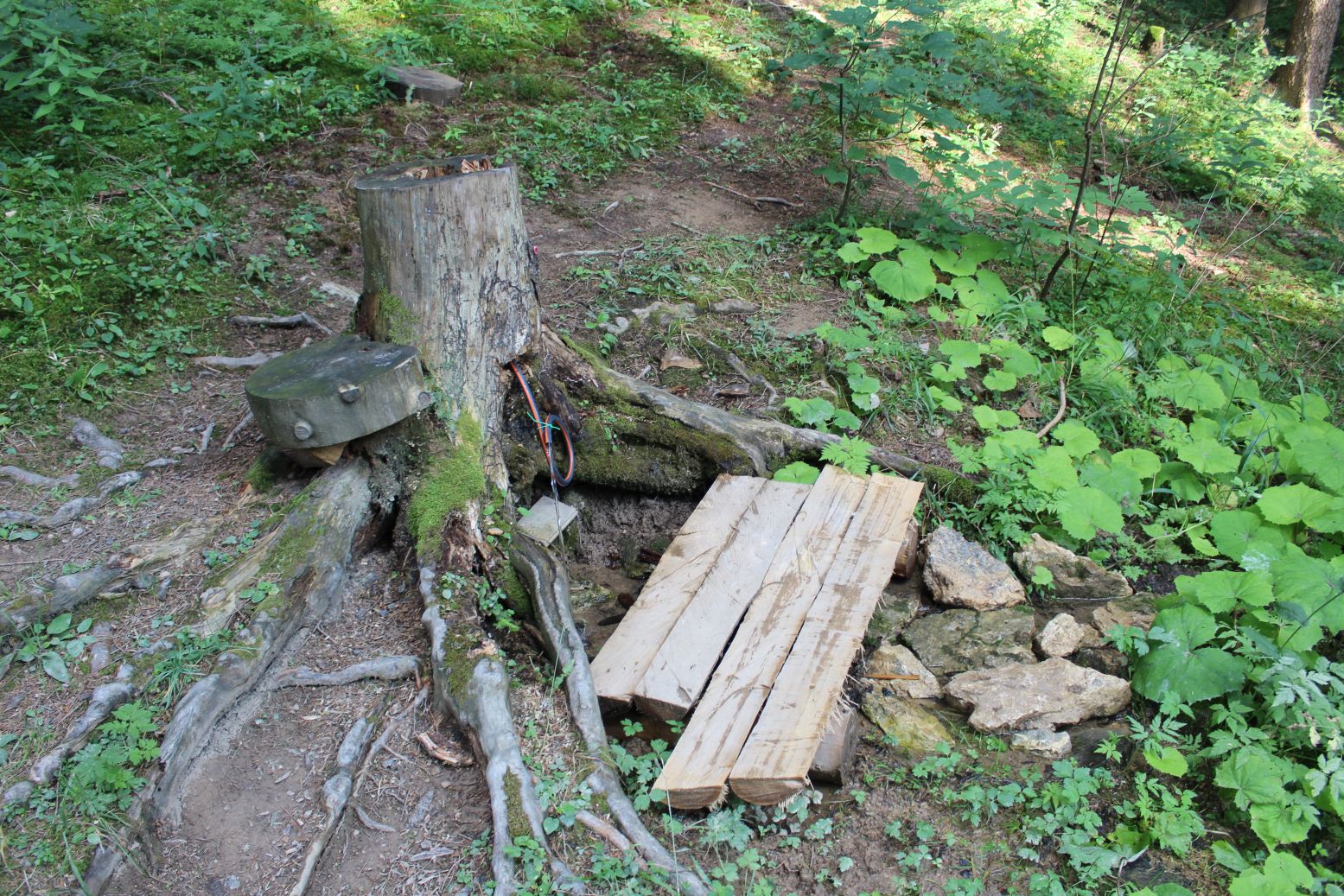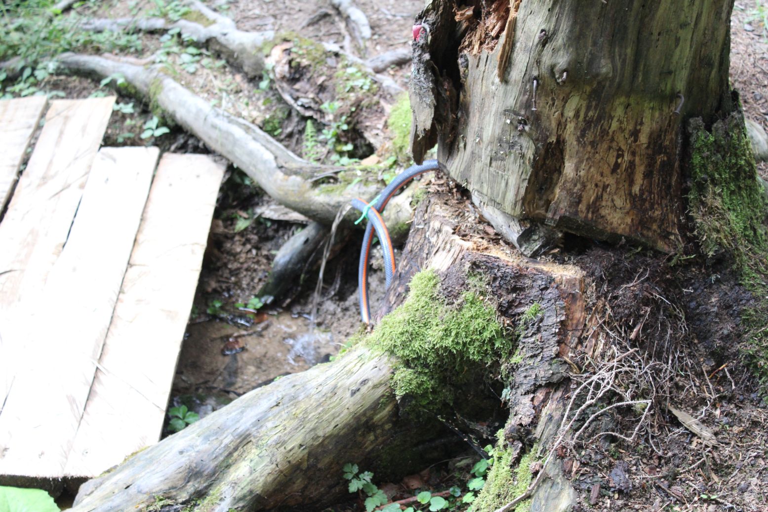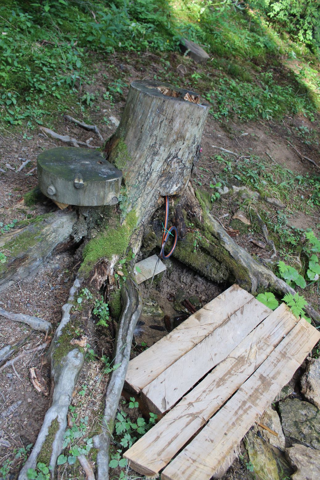 – Tvorí ho upravený peň, z ktorého hadicou vyteká voda dolu svahom.