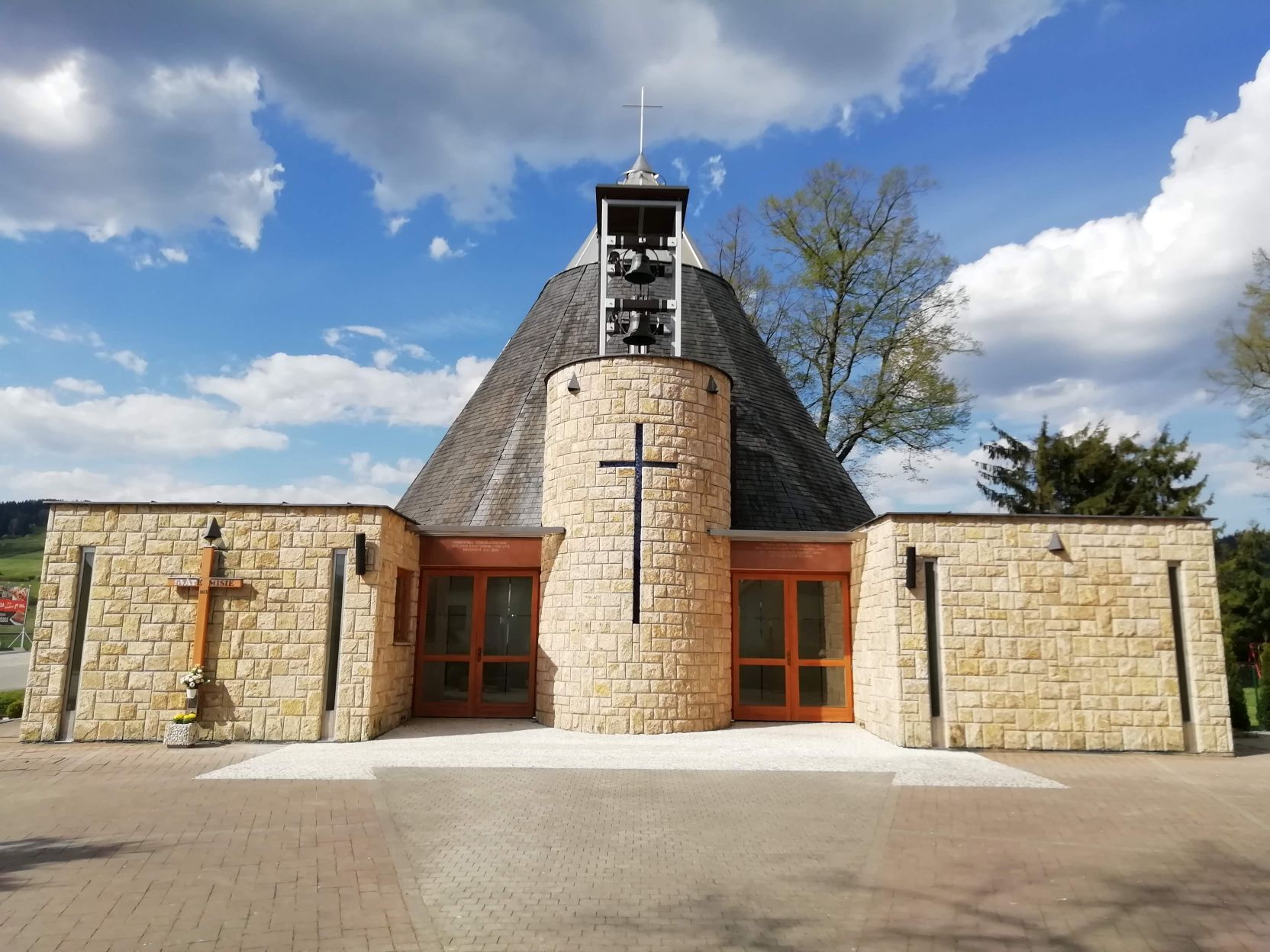 Zaujímavý je ihlanovitý tvar kostola, ktorý pri pohľade zdiaľky pripomína indiánsky stan.