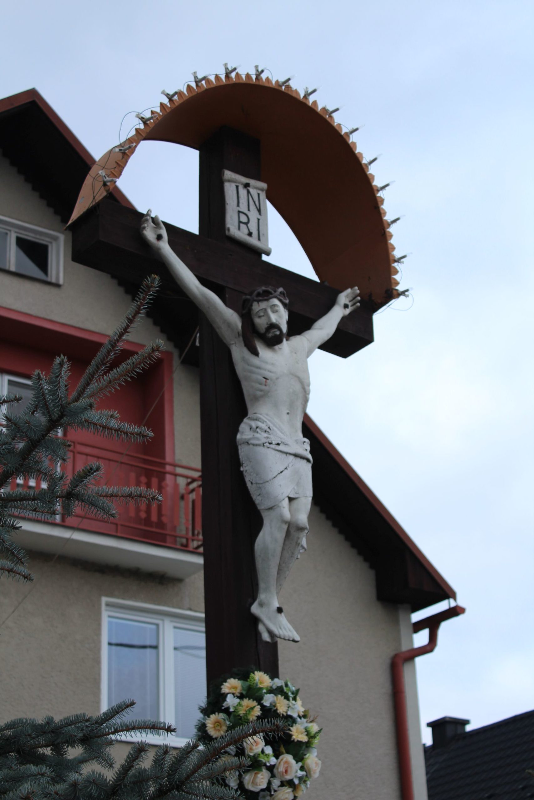 – Kríž je drevený so sochou Krista.
