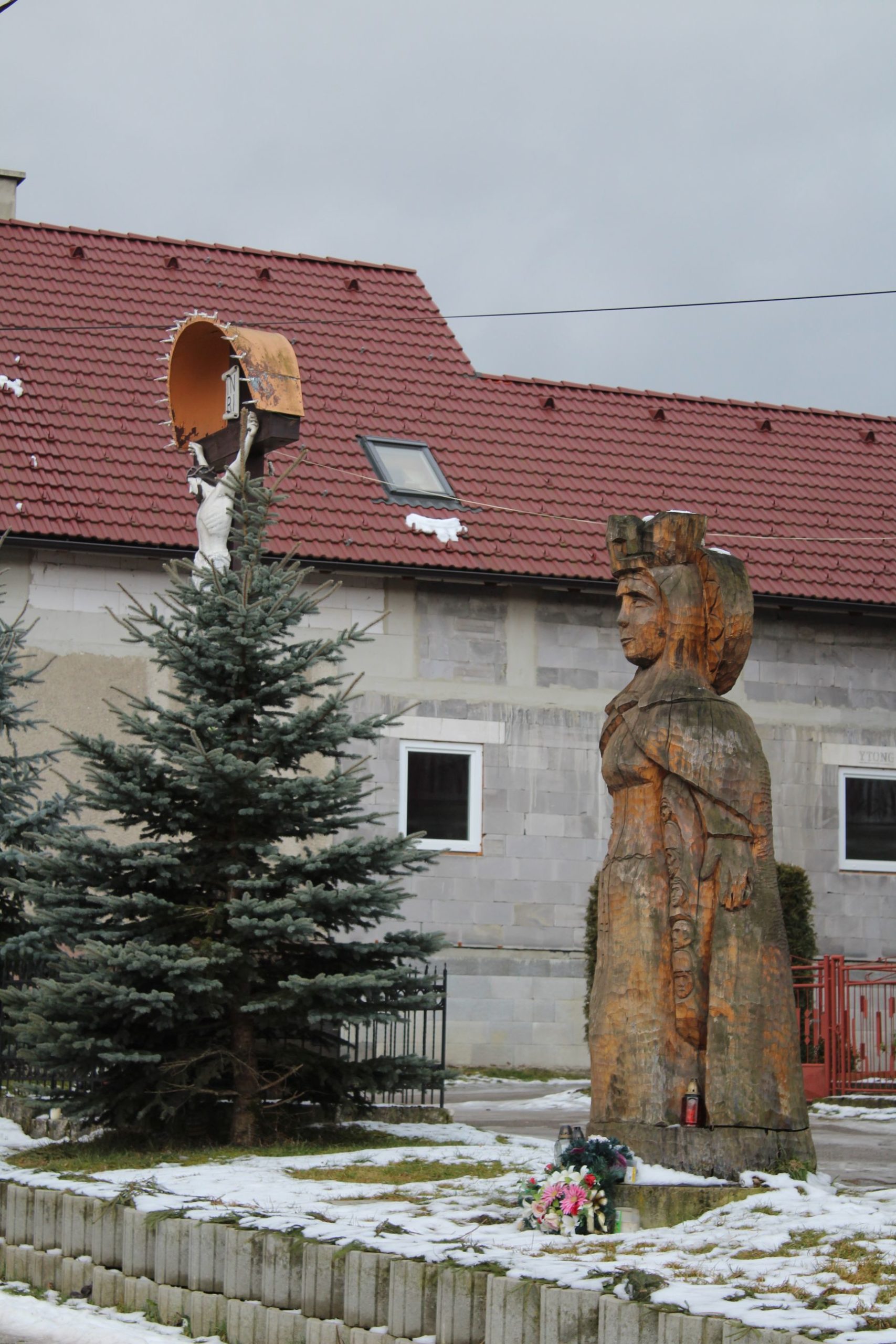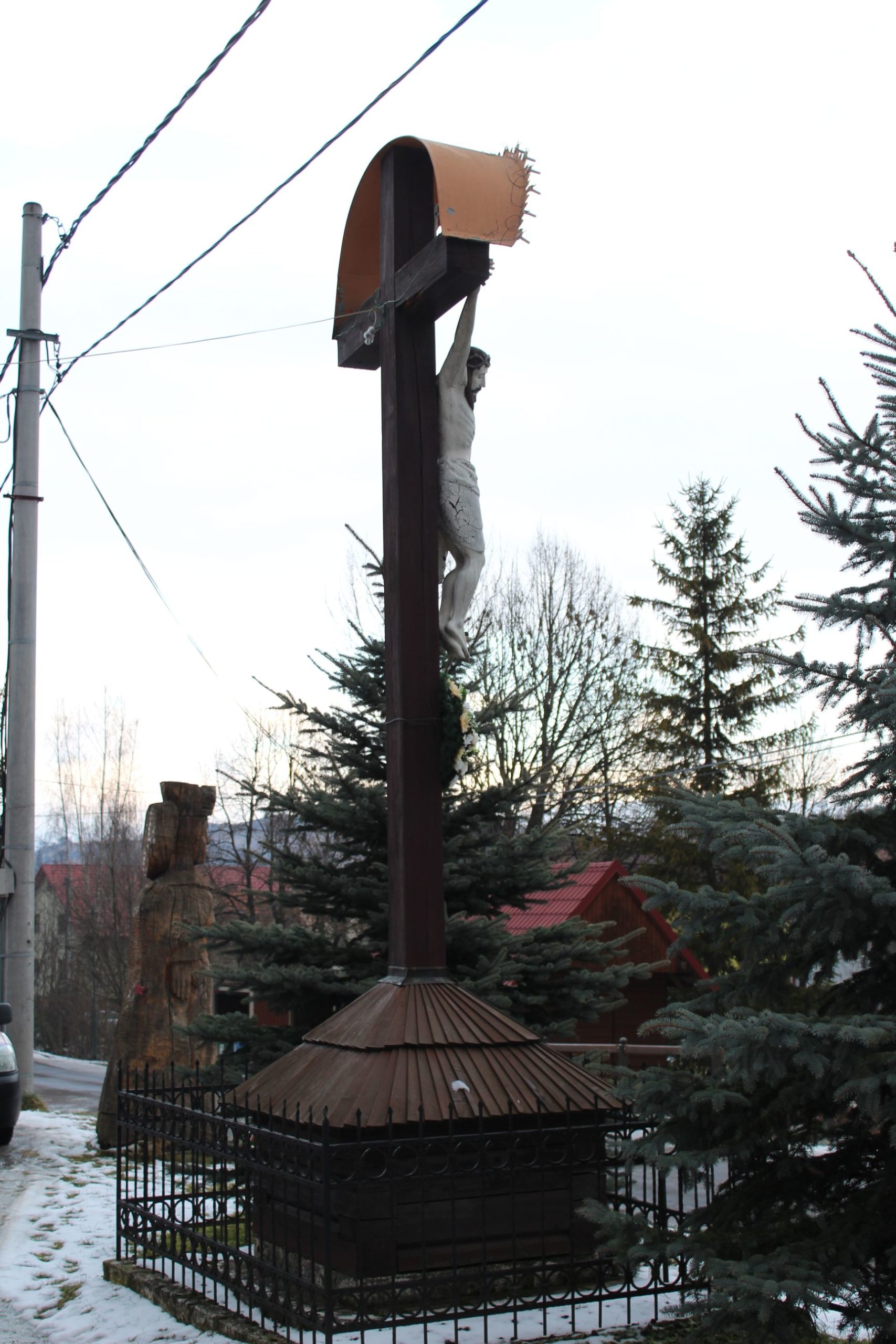 – Vedľa kríža sa nachádza drevená socha Madony Ochrankyne.