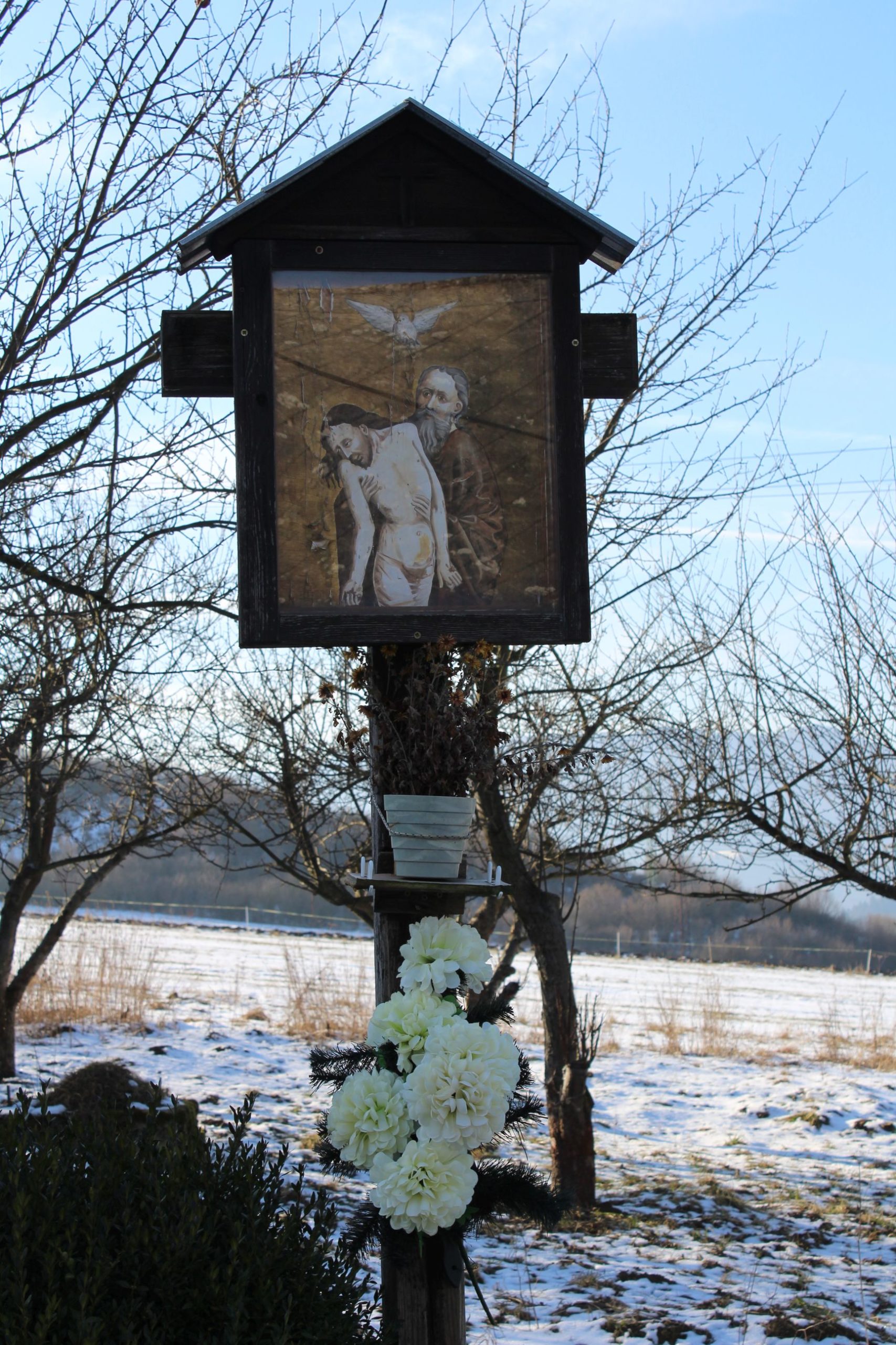 – Na kríži je umiestnený zastrešený rámik s obrázkom svätcov.