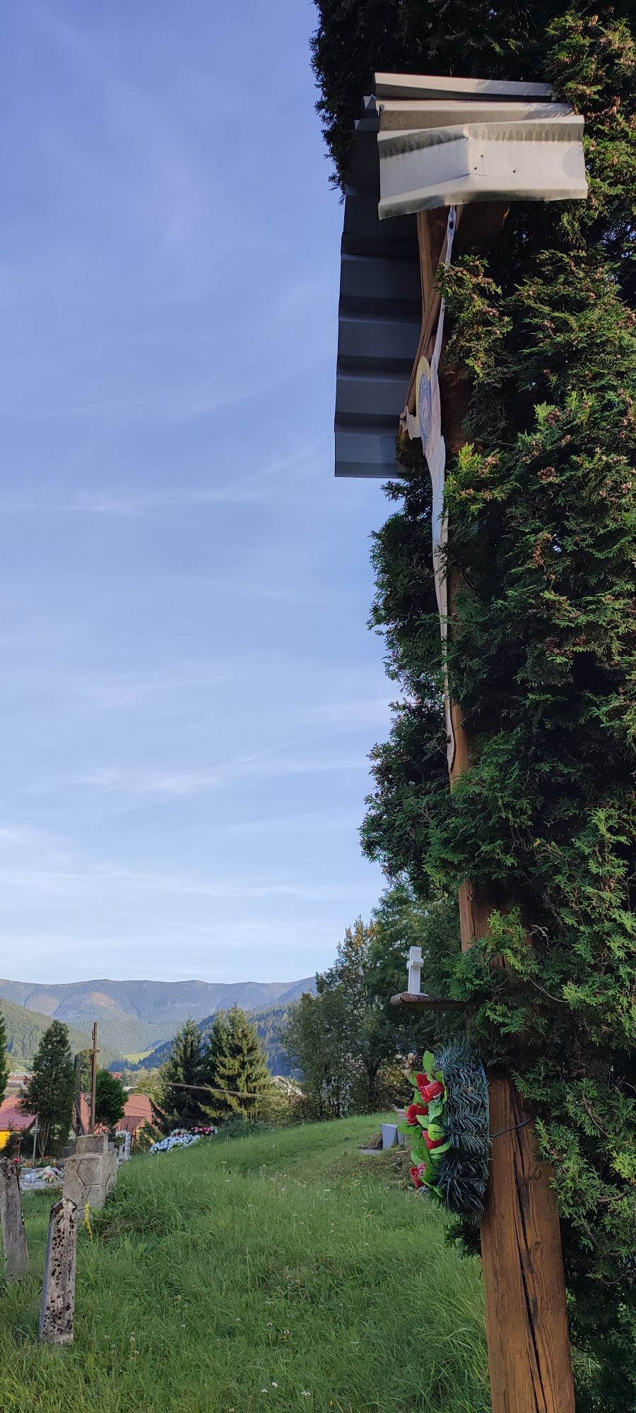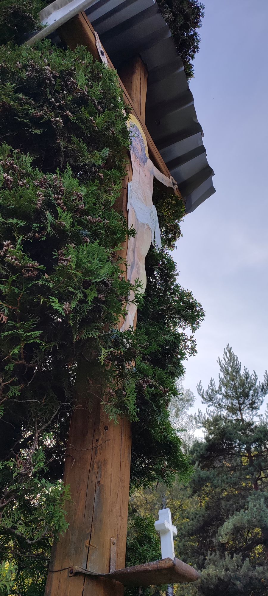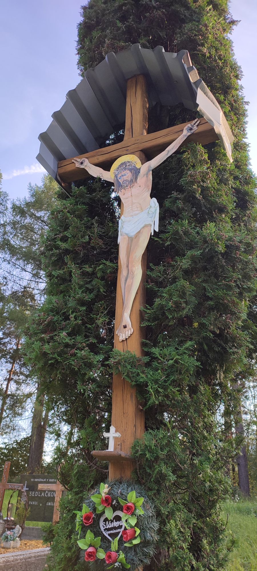 – Na kríži je umiestnená okrúhla strieška z vlnitého plechu.