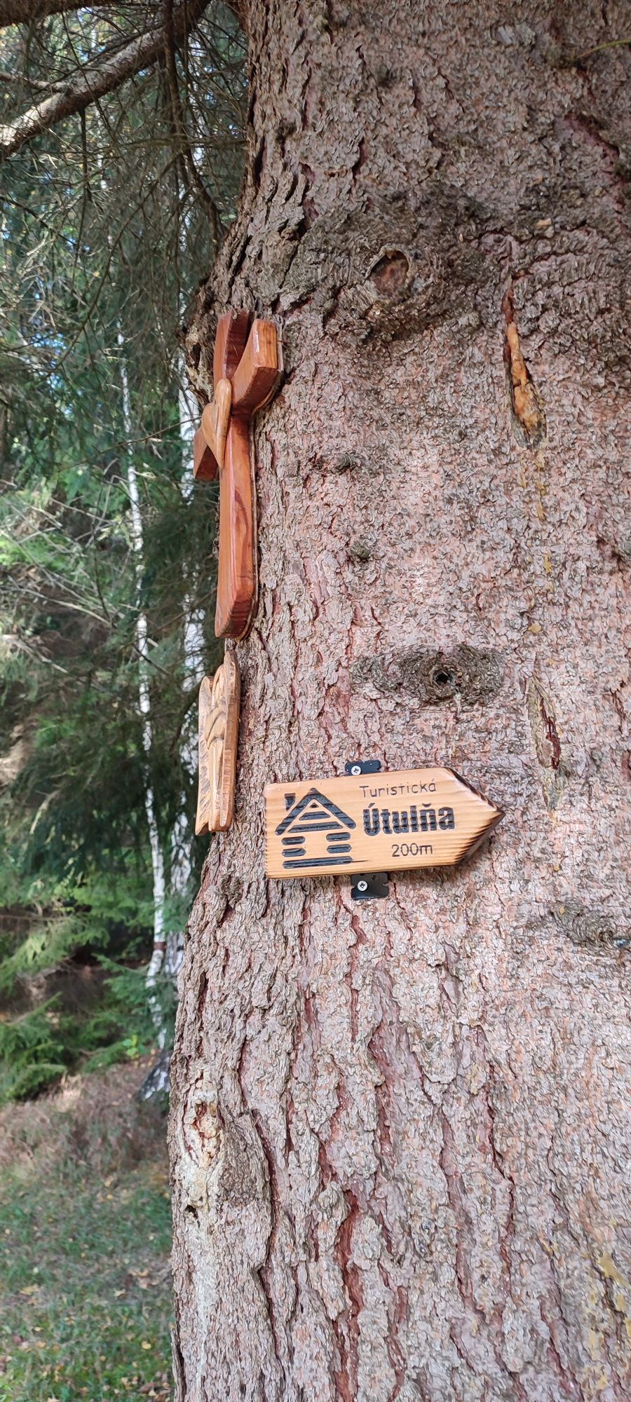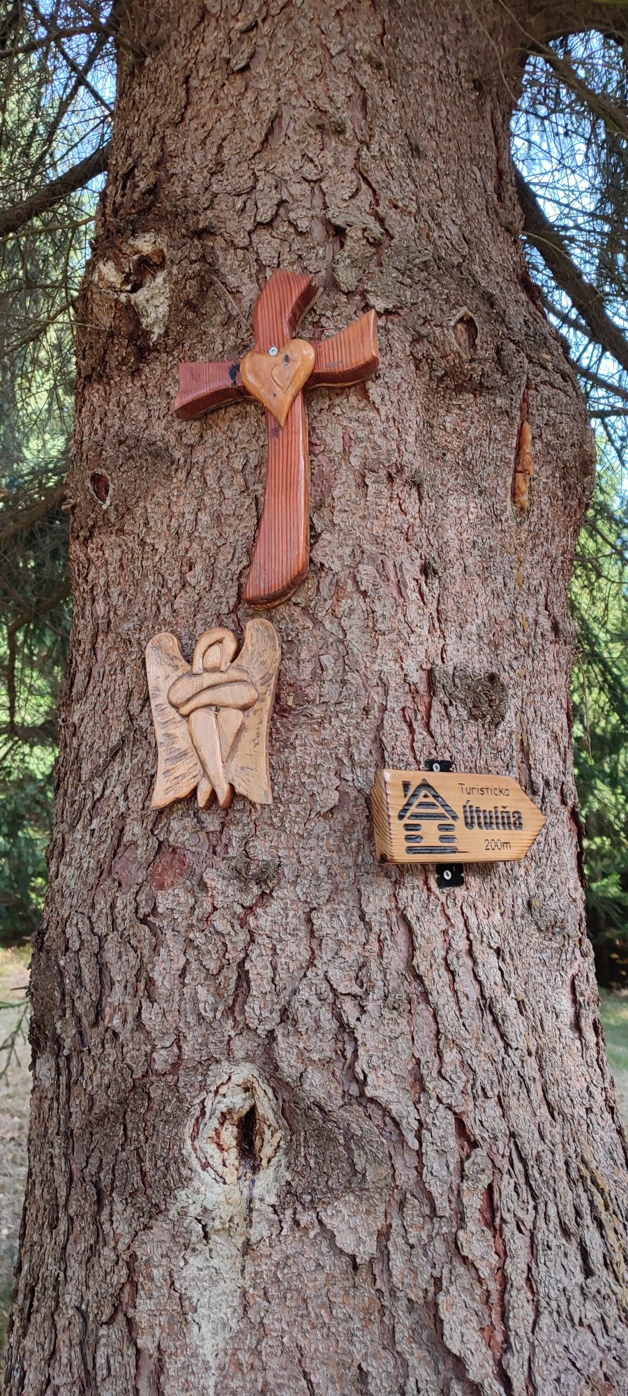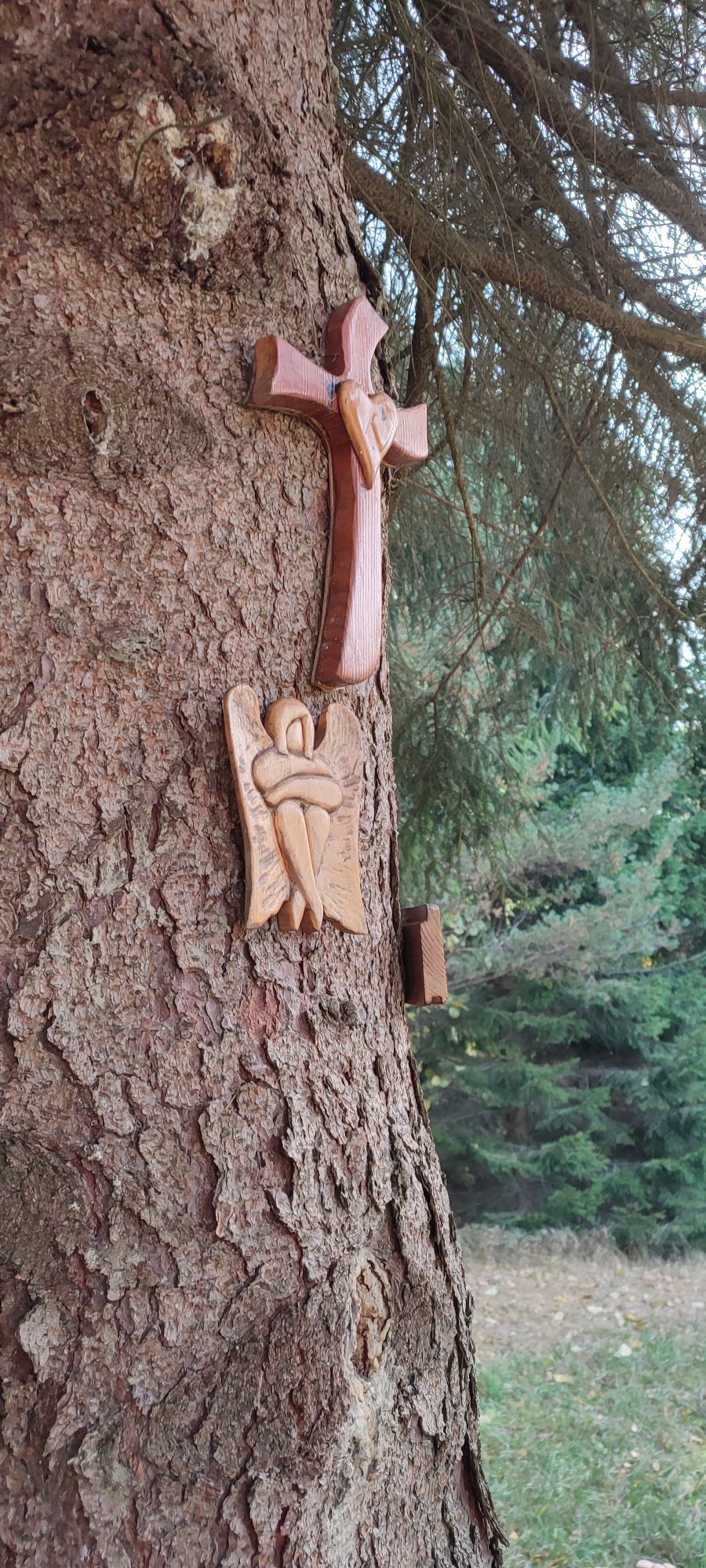 – Zastavenie tvorí drevený krížik a drevorezba anjela pripevnené na strome.