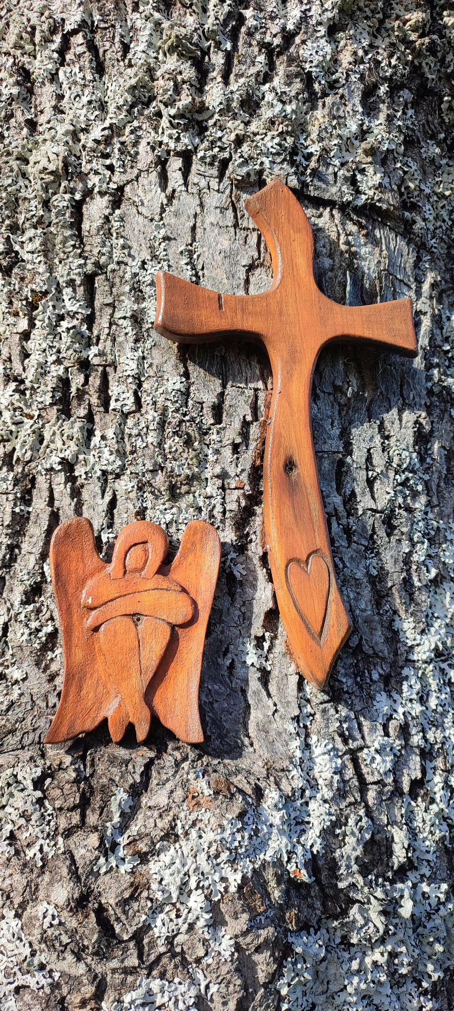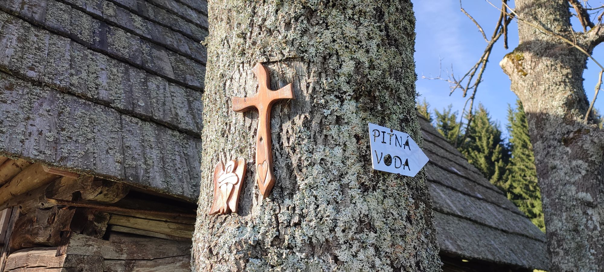 – Zastavenie tvorí drevený krížik a drevorezba anjela pripevnené na strome.